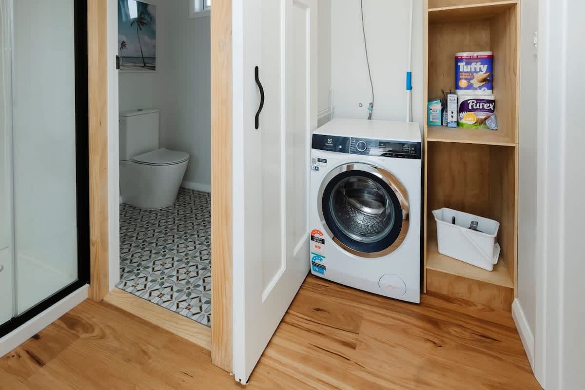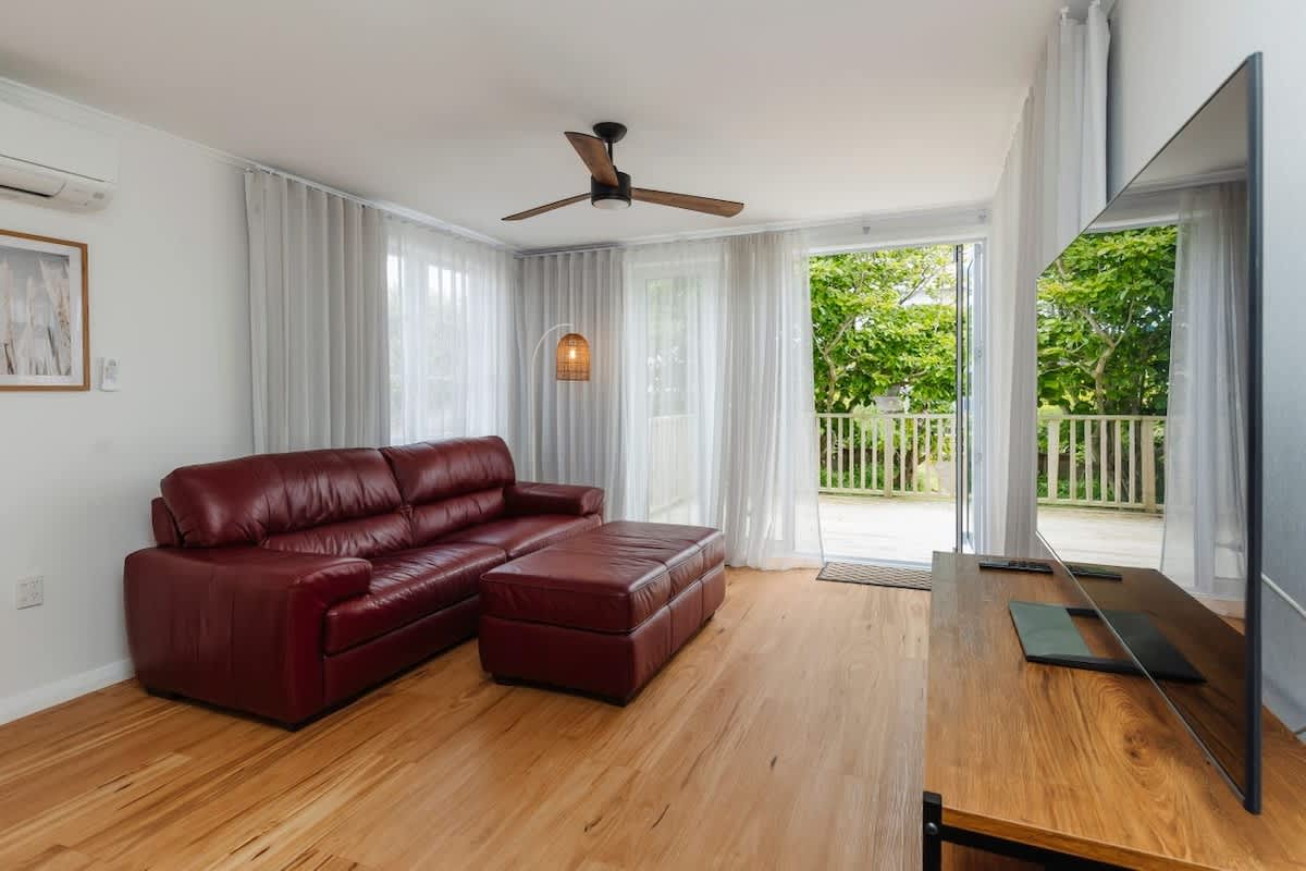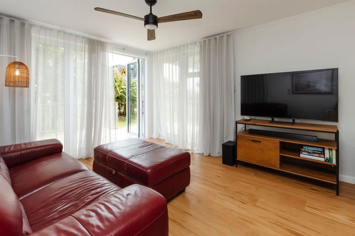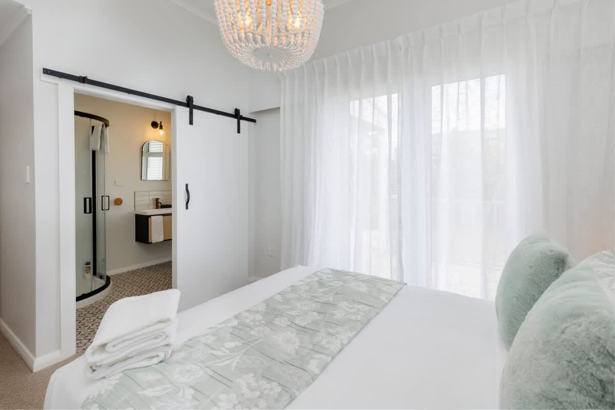 The sleeping arrangements are designed with comfort in mind. The master bedroom features a luxurious king-sized bed, an elegant en-suite, and direct access to the deck. Two additional bedrooms—one with a two singles and one with another single bed, provides ample space for family or friends. These rooms share a modern bathroom with both a bath and a shower and a separate toilet, ensuring convenience and privacy for all guests. Laundry facilities making your stay even more comfortable and hassle-free.