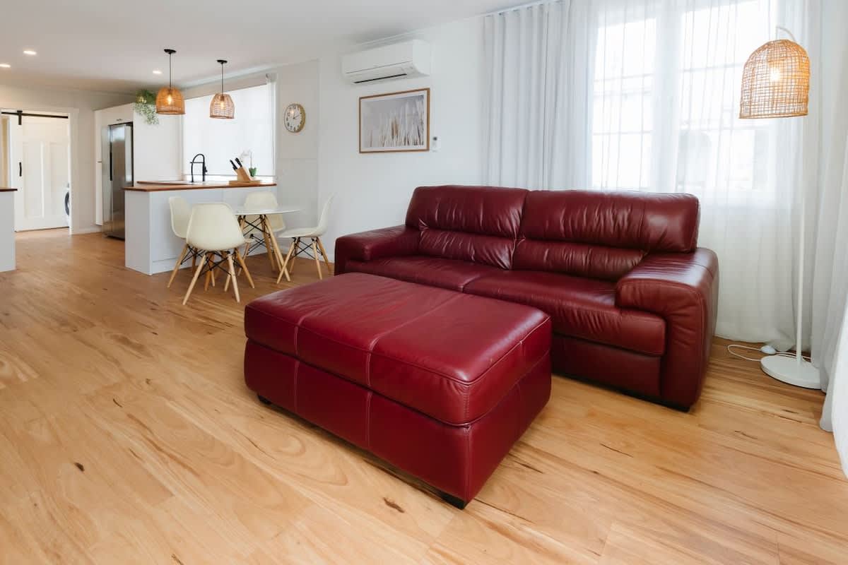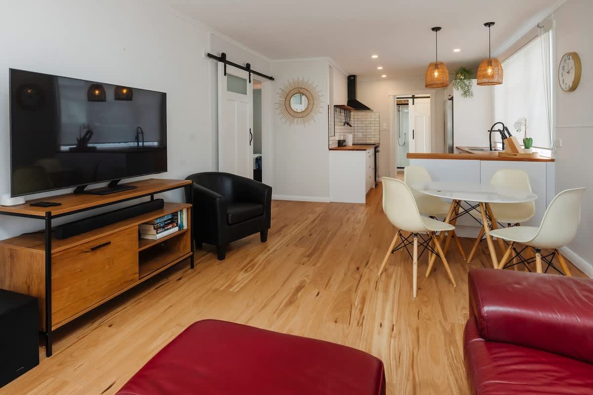 Inside, you’ll find a welcoming open-plan living area where the kitchen, dining, and lounge flow seamlessly together, perfect for relaxation. The cottage is equipped with WiFi for staying connected, and modern comforts like a smart TV ensure you're never short on entertainment. The space opens out to a large sunny deck through bifoldiong french doors, offering easy indoor-outdoor living for those laid-back afternoons in the coastal breeze.