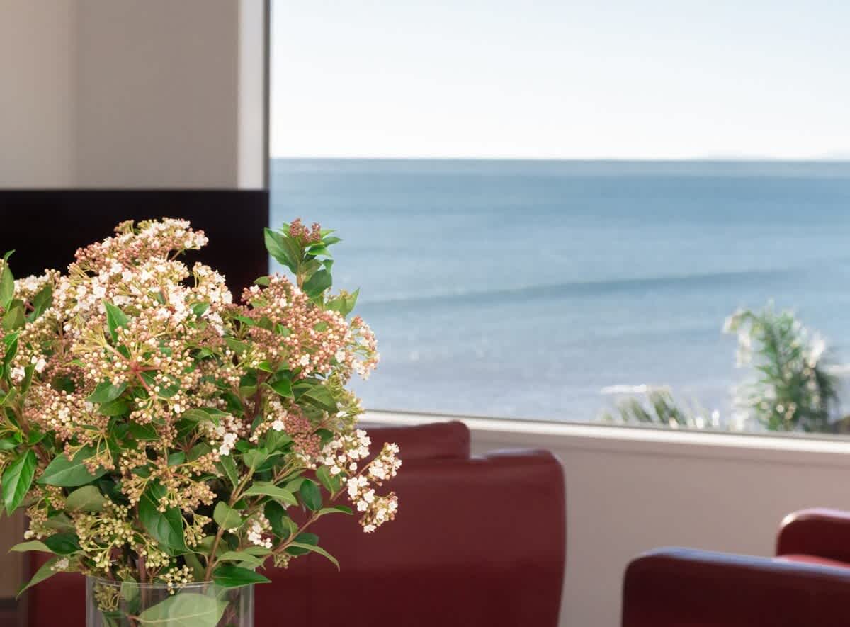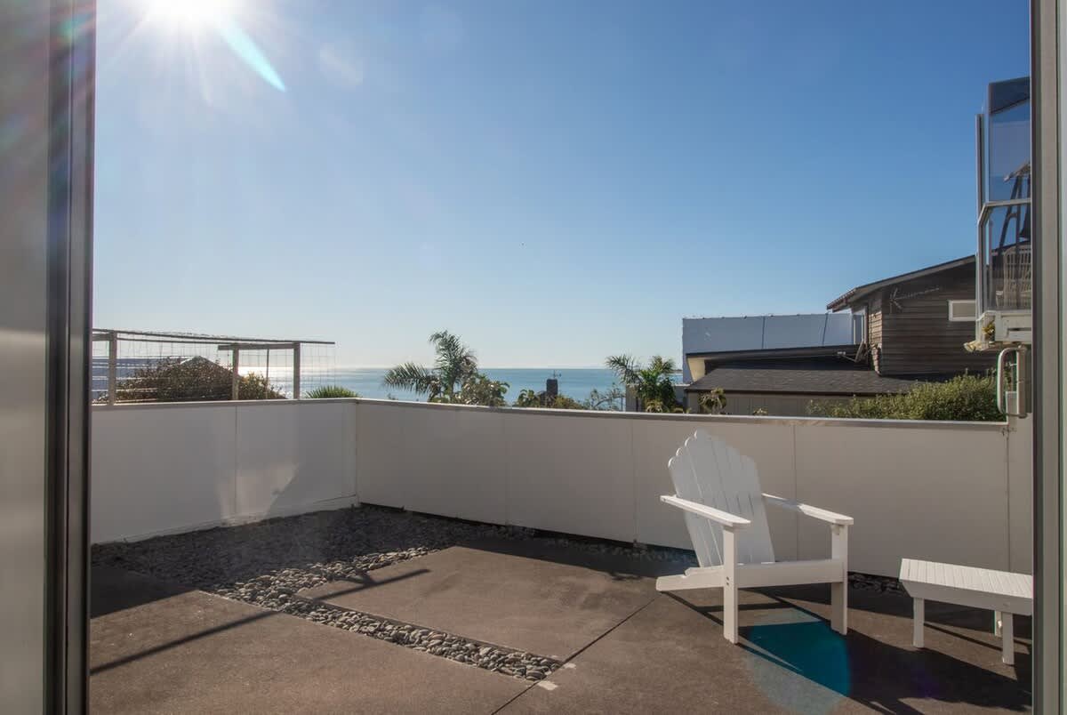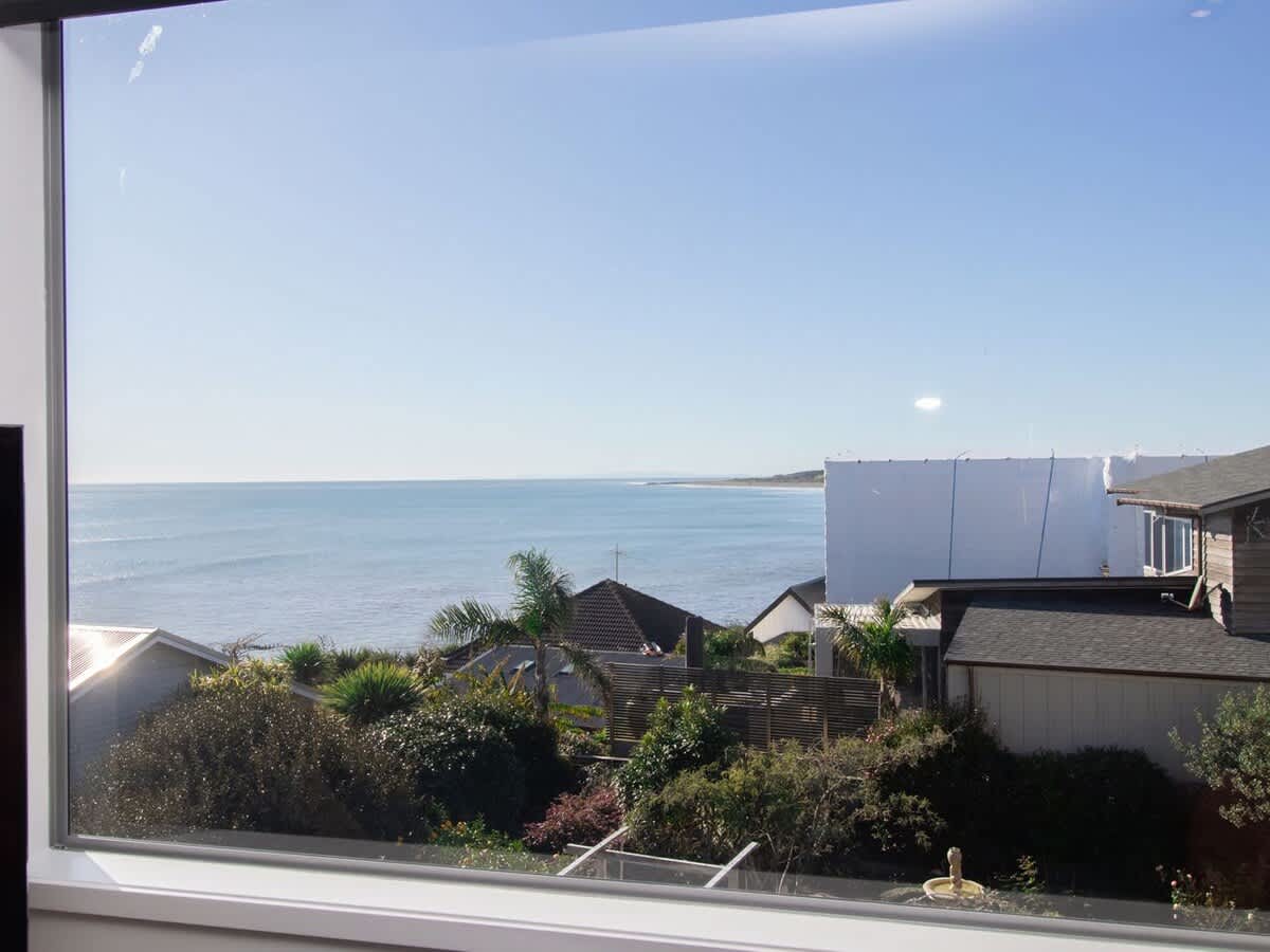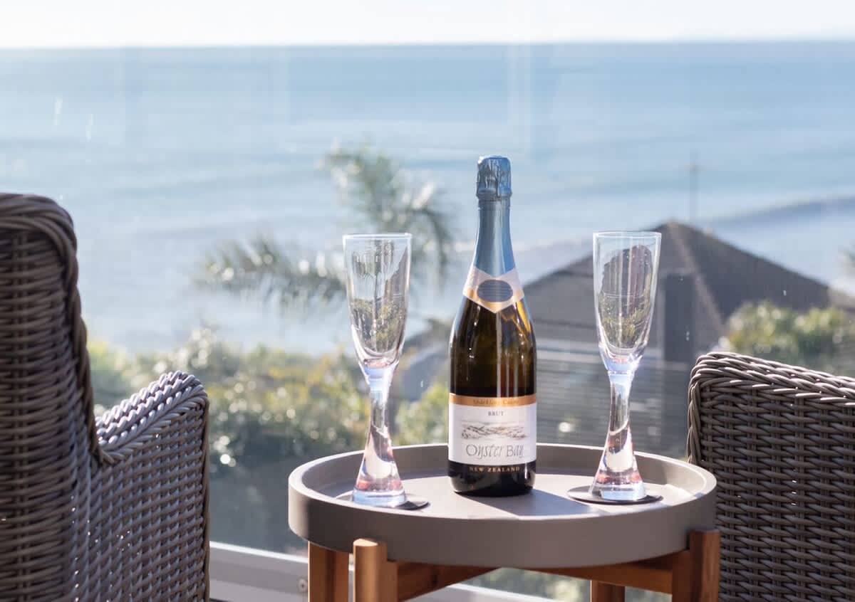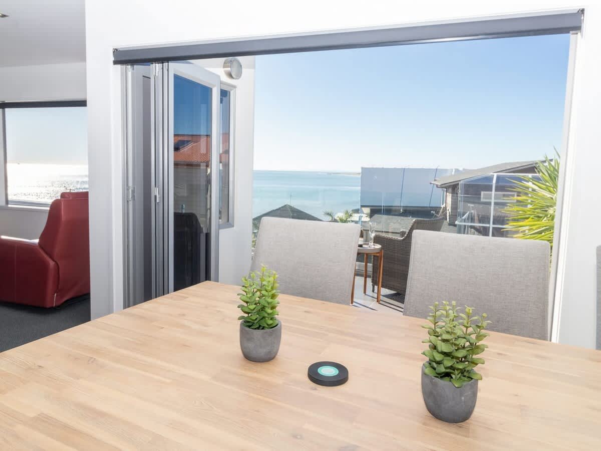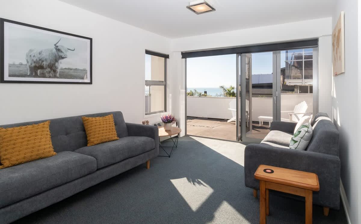 This stunning modern apartment is split over two levels providing a luxurious beachy vibe for guests to enjoy. The main living area, kitchen and master suite is on the upper level with unobstructed sparkling blue water ocean views. The calm and relaxed open plan living area opens out to a spacious deck where you can watch the surfers, windsurfers and swimmers while enjoying the sea breeze. The owners of this stunning apartment have created a wonderful homely space for travellers to enjoy and the blue water views have complete WOW factor.